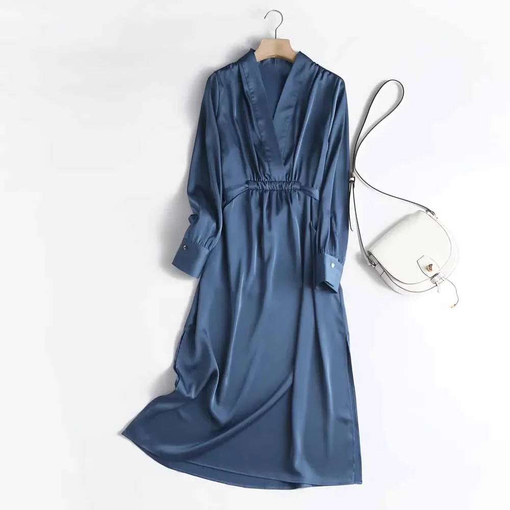 Women's new chic Fashion lace up decorative Loose side pocket casual V Neck Midi dress retro long sleeved women's dress